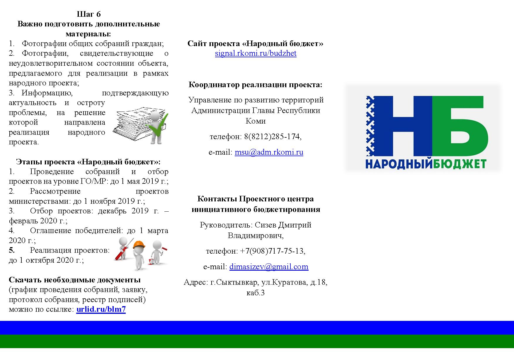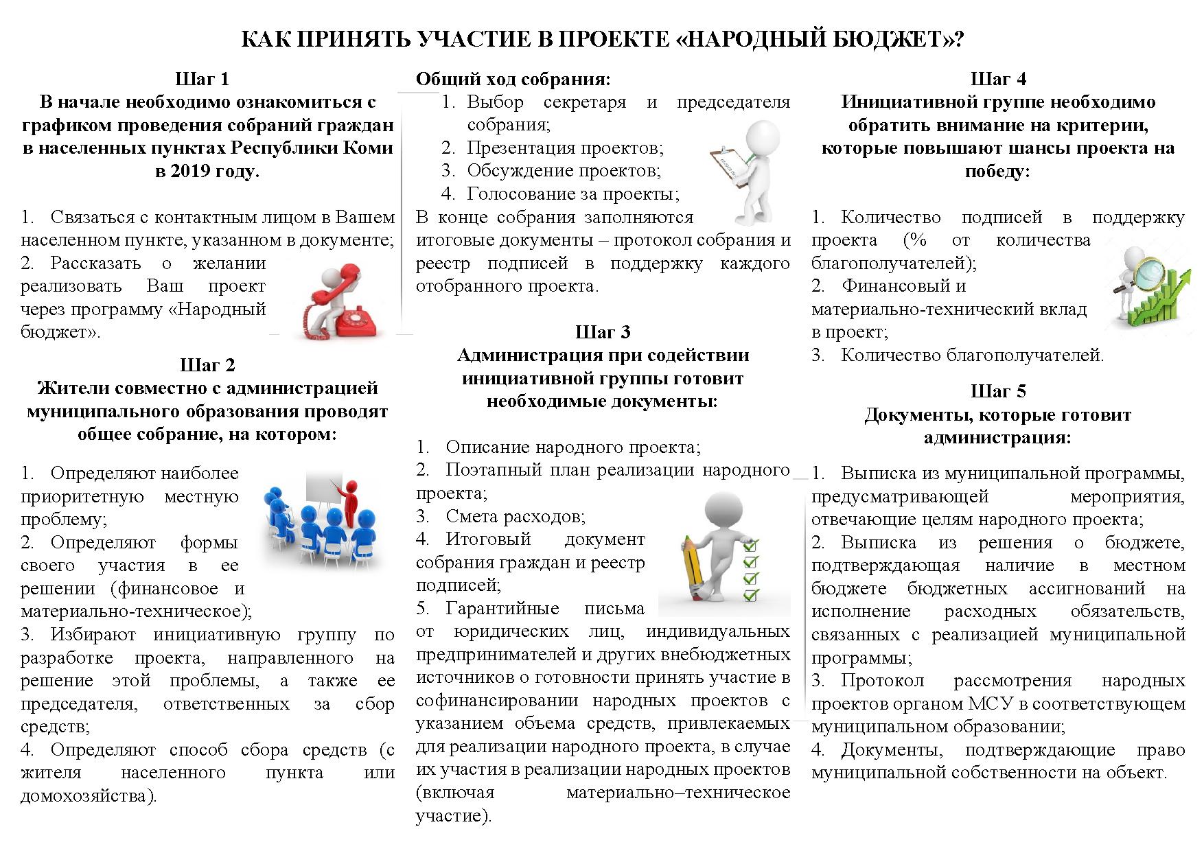 Для участия в реализации проекта «Народный бюджет» предлагаем ознакомиться с пошаговой инструкцией (часть 1, часть 2). За более подробной информацией можно обратиться в управление по связям с общественностью и социальной работе администрации муниципального образования городского округа «Сыктывкар» по телефонам: (8212) 294–226, 294–149.
